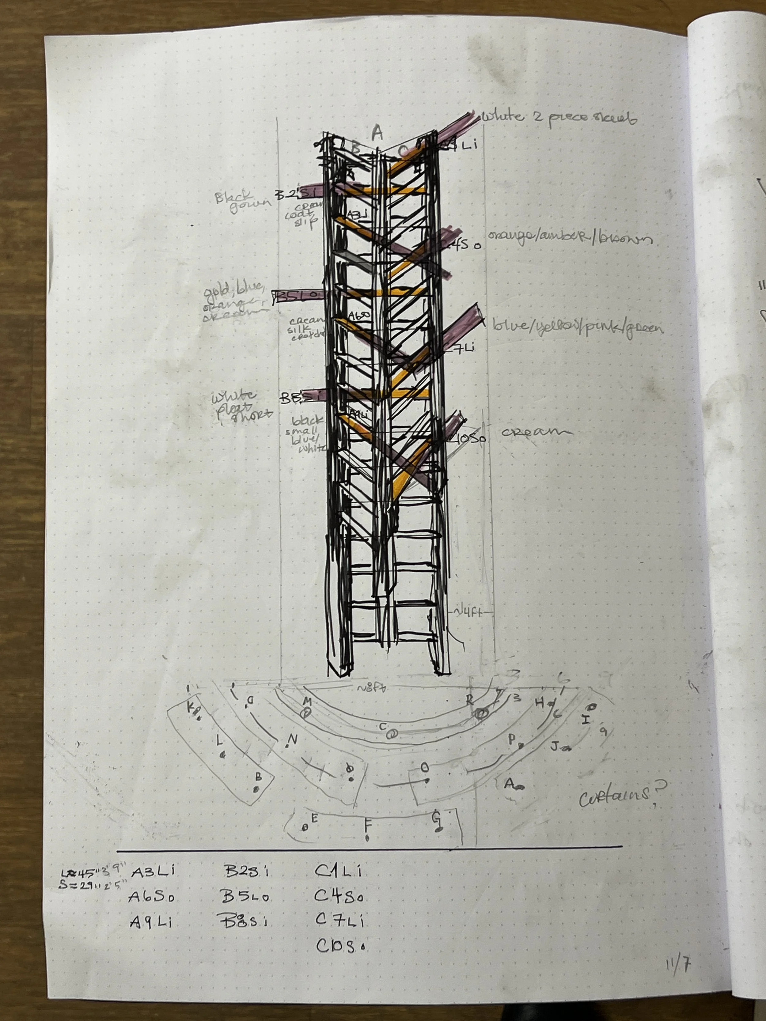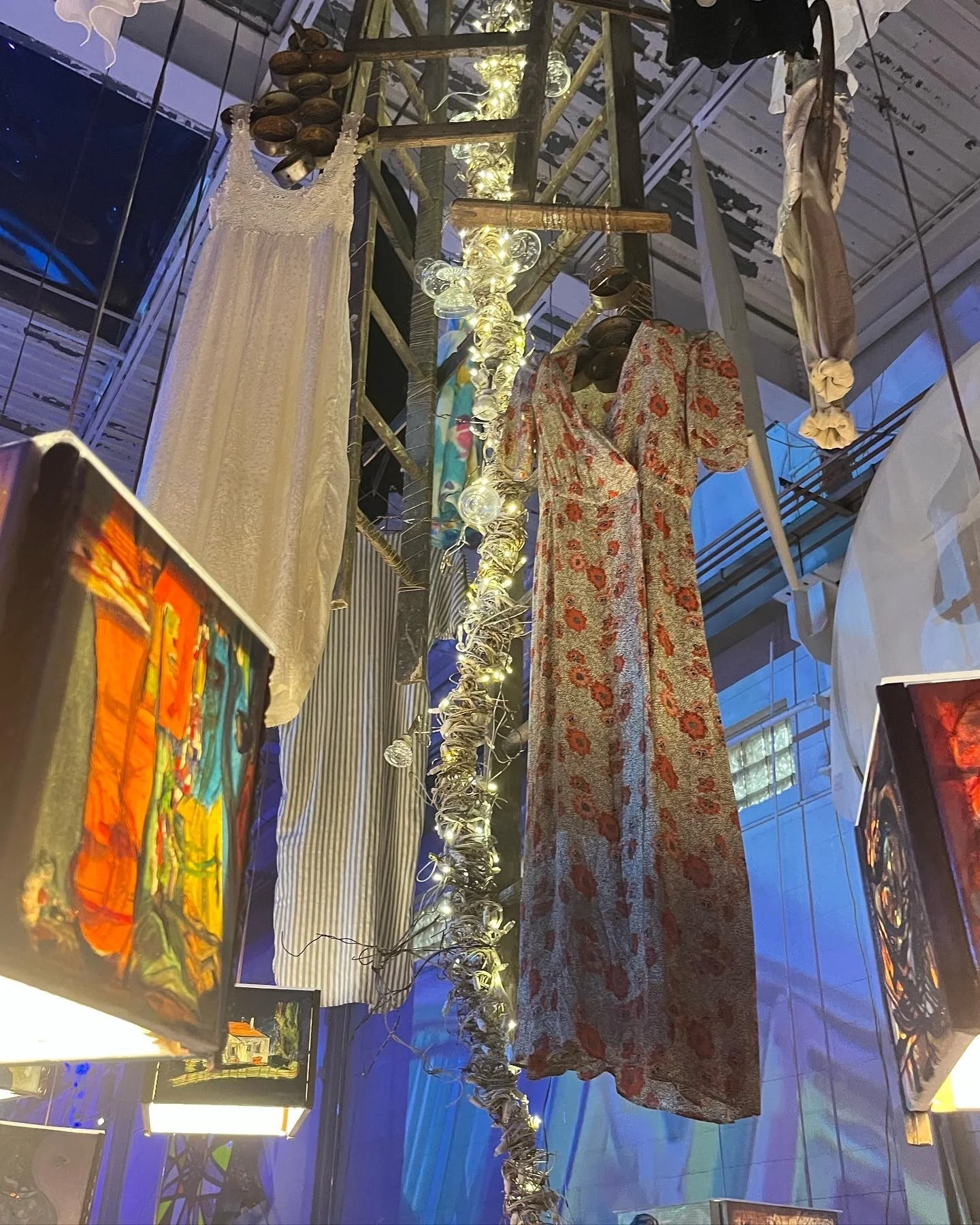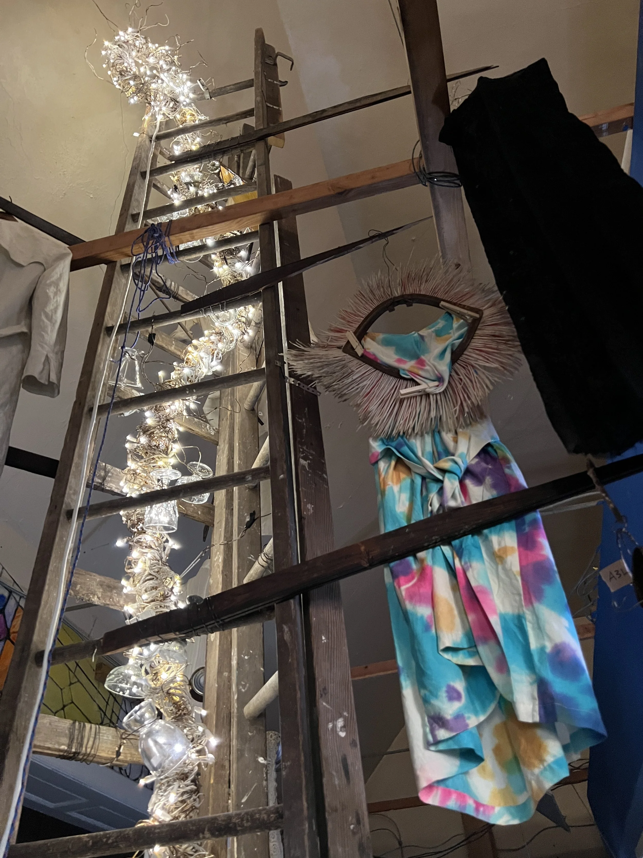 At the center, there is a light strand. It is the light within us all and reflects our true selves of loving kindness. Glass cups pour out from the sky and the luminosity of our emotions increase. An amber band at the missing rung reflects faith the size of a mustard seed, a reference to my Mother’s notebooks and the hope we hold onto when we cannot and will not believe the truth of our core being. Hanging ladders construct the first element of Mandlebrot’s Fractals - a triangle. The ladders reflect the rat race climb of human productivity we reduce ourselves to and the ethereal impossibility of climbing a ladder to the heavens to reach those who have gone before us. Clothing is a beautiful element of protecting our core selves and how we present to the world, and yet the light shines through. The clothes are our earthly veils and convey how we chose to be here on Earth. Each outfit tells a story. Each rung spins closer to the grounding truth of the canvases. Door knobs at the bottom of the light strand open the door to the House of Life where we inhabit this dual consciousness of awareness.