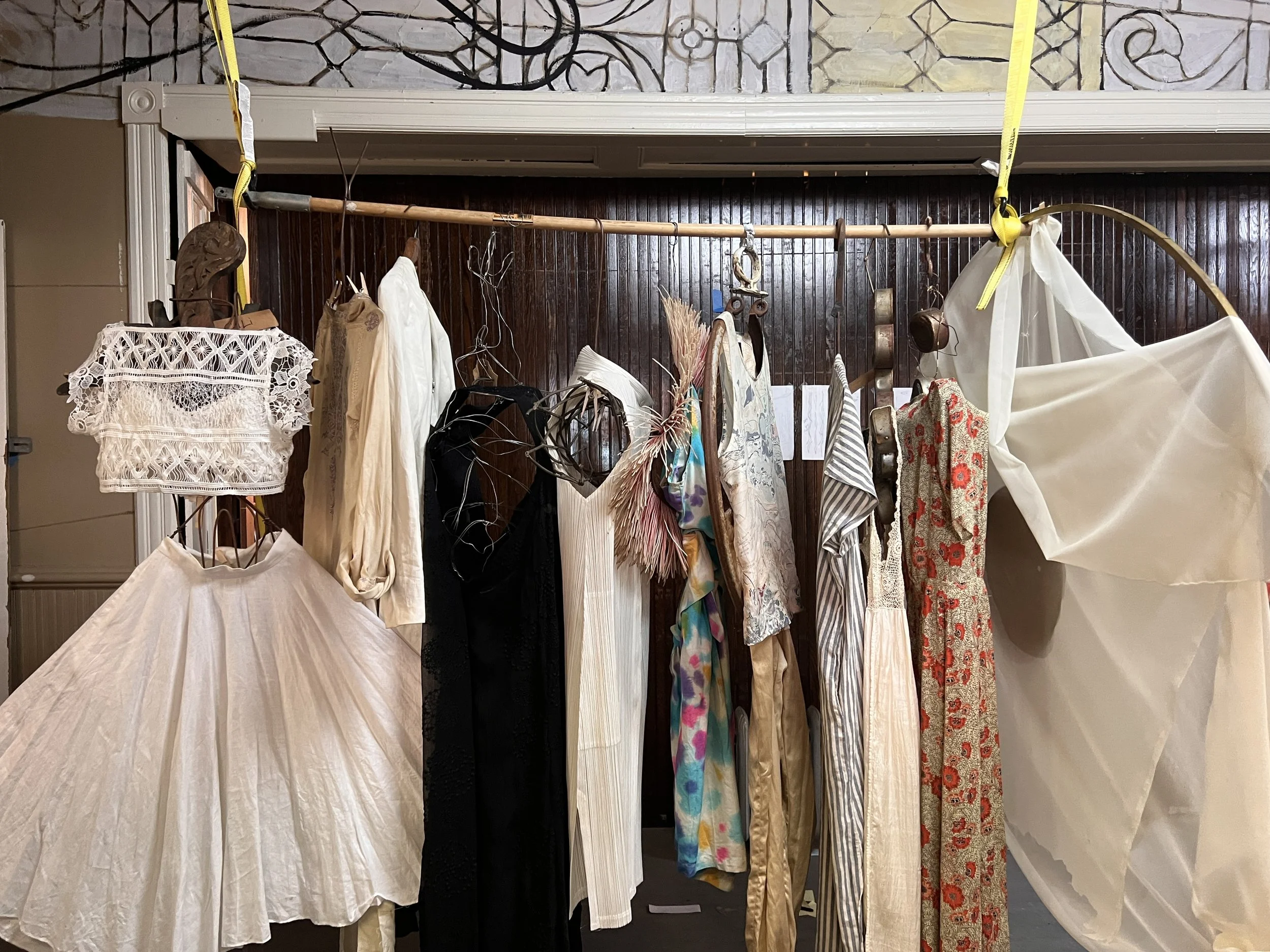 This installation presents two paintings on the ground - one dealing with the philosophy of living life and the other an erratic meditation on a chosen death. Hanging elements symbolize the chaos of two truths - you are alive and you will die - and the stuff of it all begs the question - why am I holding onto you, dear things?